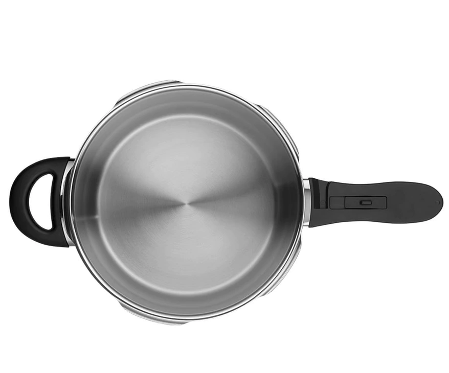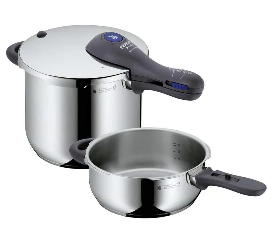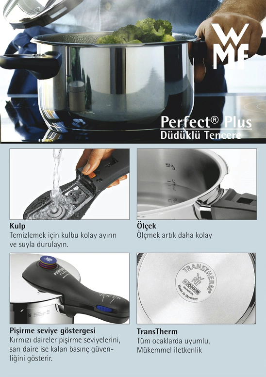 As panelas de pressão WMF são a escolha perfeita para quem tem pouco tempo, mas quer preparar refeições saudáveis e deliciosas. Sua comida é cozida em fogo e pressão elevados. Desta forma, as suas refeições serão preparadas em muito pouco tempo e você economizará até 70% de energia. Embora a comida retenha vitaminas e minerais, ela terá um sabor perfeito. Tecnologia experimentada e testada em design moderno. Fácil de programar com apenas alguns cliques. Os anéis vermelhos no indicador indicam diferentes configurações de cozimento. Graças ao mecanismo de segurança de pressão, você pode abrir sua panela com segurança. A característica mais importante que diferencia as panelas de pressão WMF Perfect é que você pode remover a alça da panela para limpá-la.
