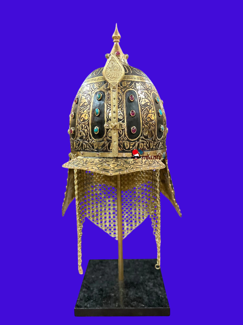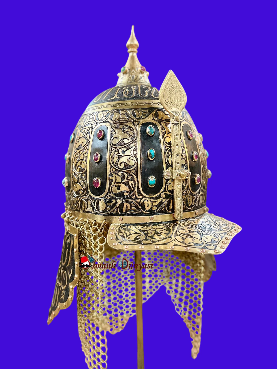 Every detail of the helmet showcases the intricacies of craftsmanship and the elegance of Ottoman art. Inscribed with beautiful words and praises about Allah and His Messenger, the helmet is meticulously adorned with ruby and turquoise stones, and entirely plated with 24-carat gold. Faithfully crafted to the original dimensions and entirely handmade, the interior is lined with genuine felt to maintain authenticity.