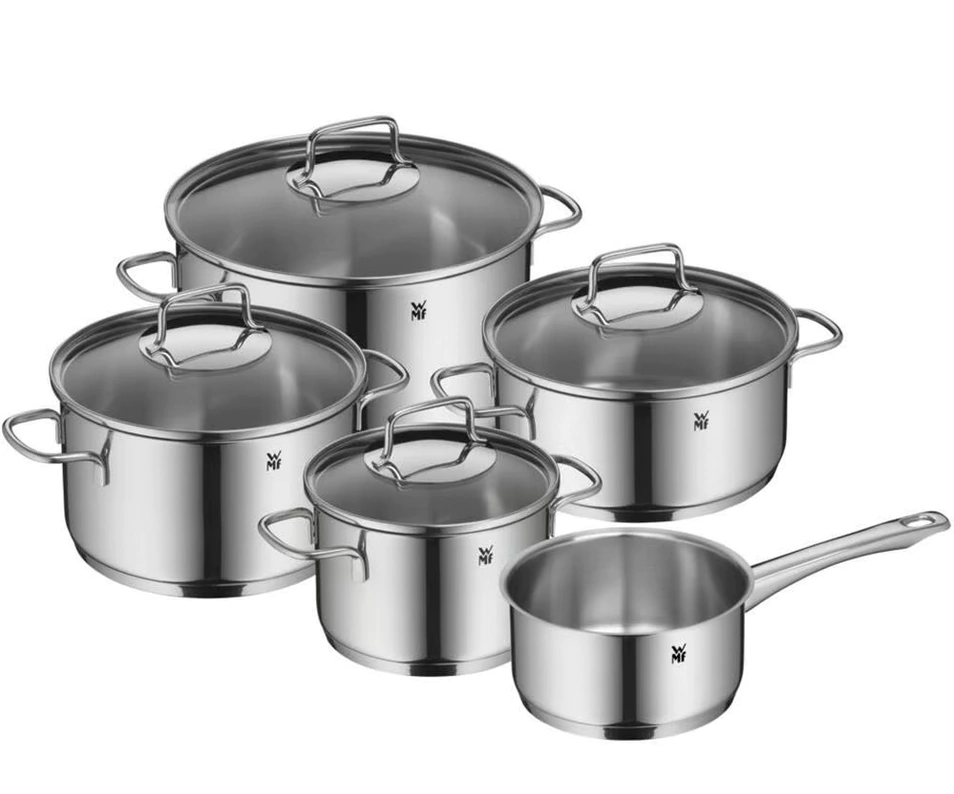 WMF Astoria Cookware Set 5 Pieces NPSP129H78 SEA AND CHERRY NPLS ---------------------- With their striking design and delicate details, WMF Astoria pans bring together the best of both worlds. Developed with all the expertise of German manufacturing, this modern pot and pan set comes in a variety of sizes and heights for all types of cooking and a stunning mirror-polished surface that will elevate any kitchen. At the same time, sleek, heat-resistant glass lids promise easy viewing, while wide edges ensure effortless, drip-free serving. Cooking results are equally perfect thanks to the TransTherm® universal base, which offers optimal heat distribution and retention for every meal. Compatible with all stovetops, including induction, Astoria cookware is made from sleek, sophisticated Cromargan®, which promises exceptional dishwasher durability. Weight: 7370g Cooker type:Induction - Gas - Electric - Ceramic - Halogen Care: Dishwasher safe, but we recommend hand washing Products included in the set: Soup pot (24 cm) and lid, Soup pot (20 cm) and lid, Saucepan (20 cm) and lid, Soup pot (16 cm) and lid, Saucepan (16 cm). 100% Original (***Important notice: Before purchasing the product, ask about stock and delivery time of this product! This product is not shipped to all addresses.) SKU: SEABWMFH78 Imported product